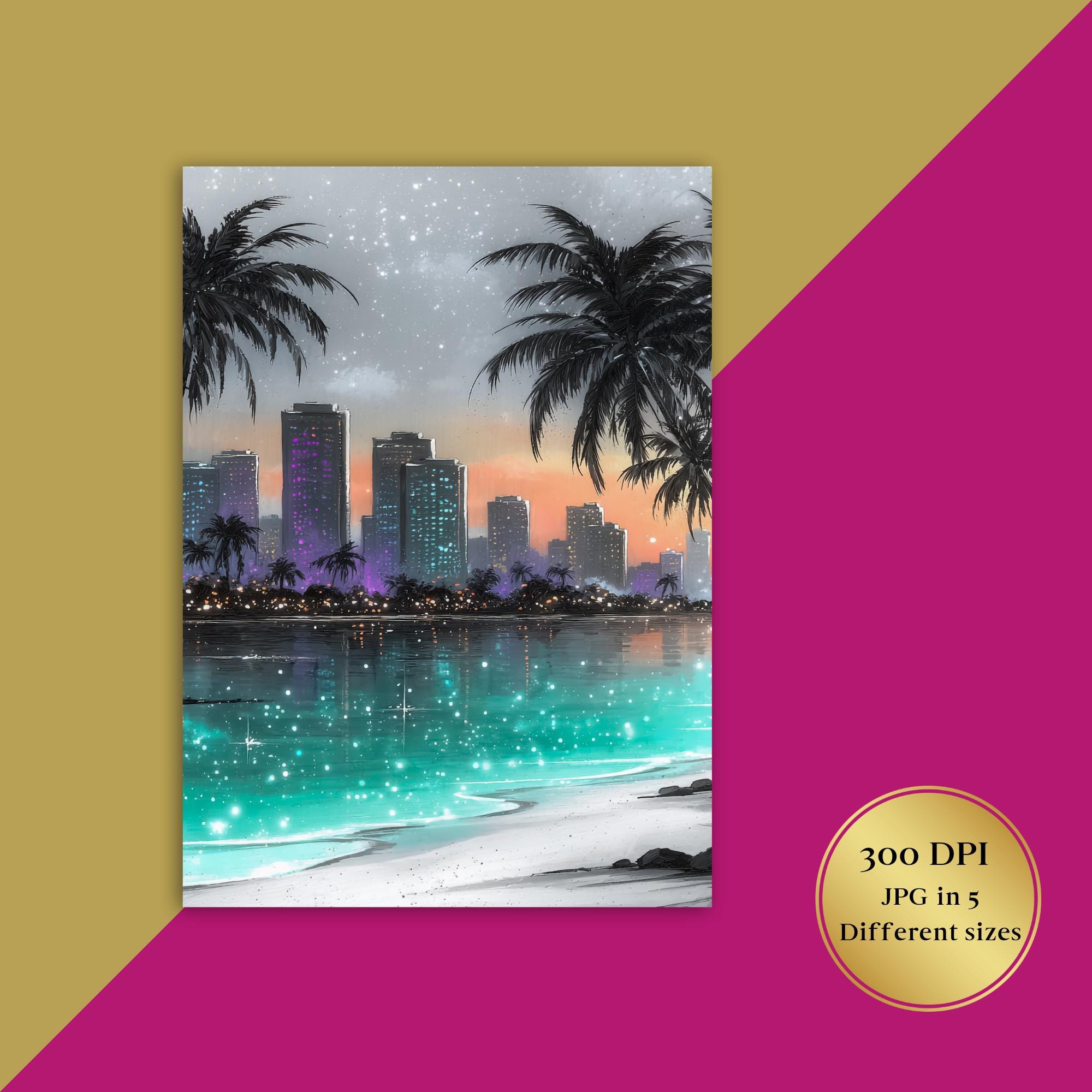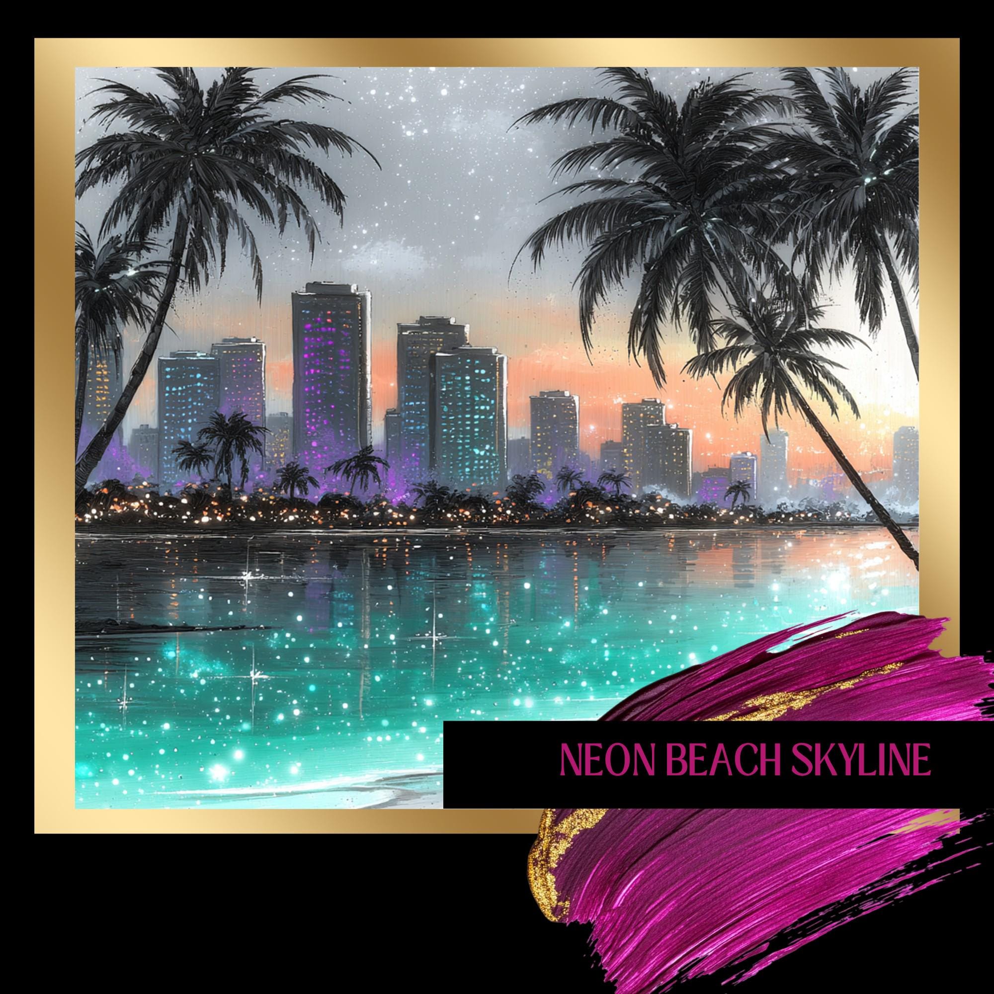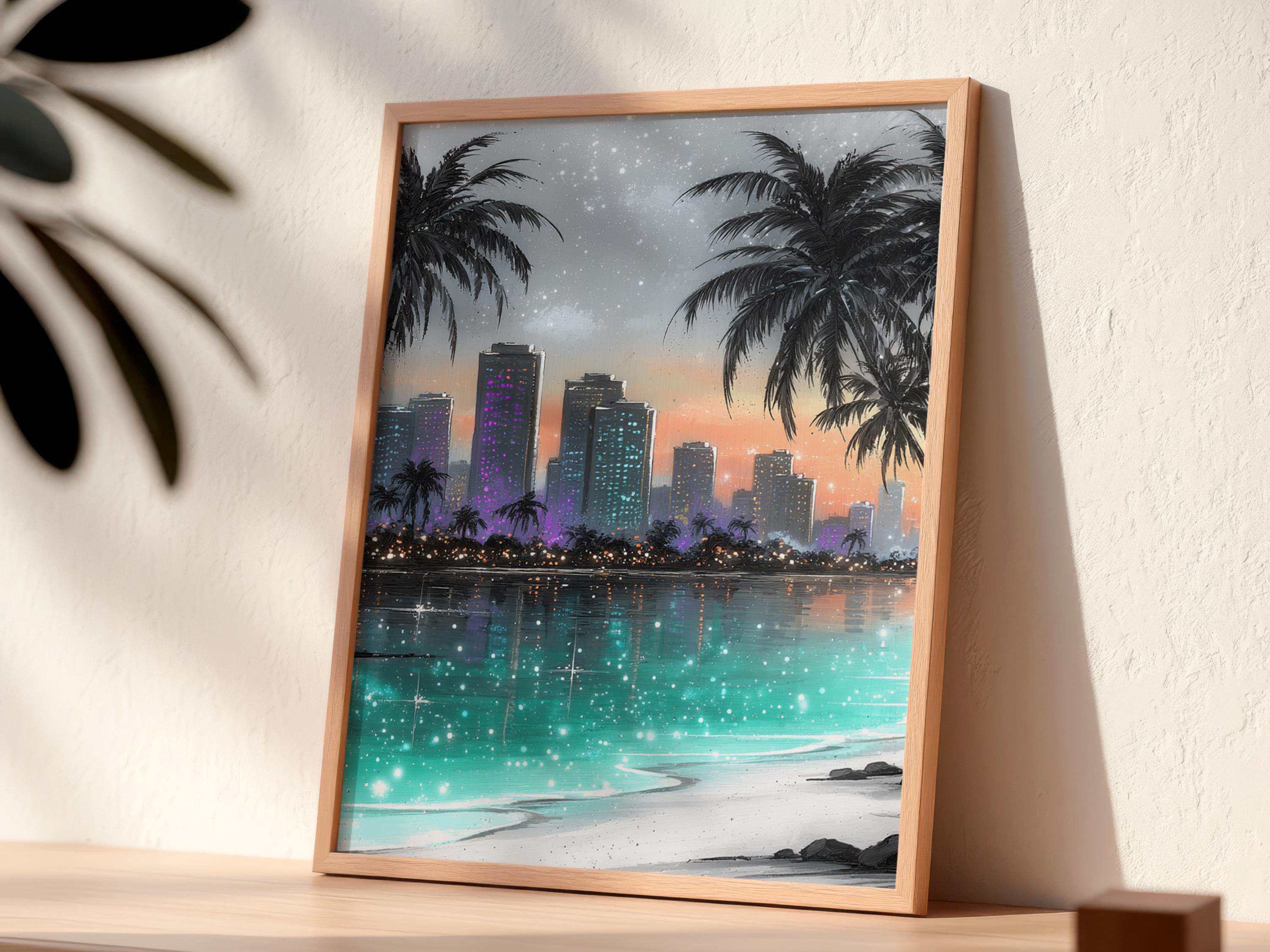 Immerse yourself in a serene blend of tropical wall art and coastal decor with this captivating cityscape print. Palm trees gently sway beside a glowing skyline, capturing the magic of a beach skyline art scene that invites calm and inspiration. Perfect for modern spaces, this digital wall art transforms any room into a dreamy retreat where ocean city artwork meets contemporary style.