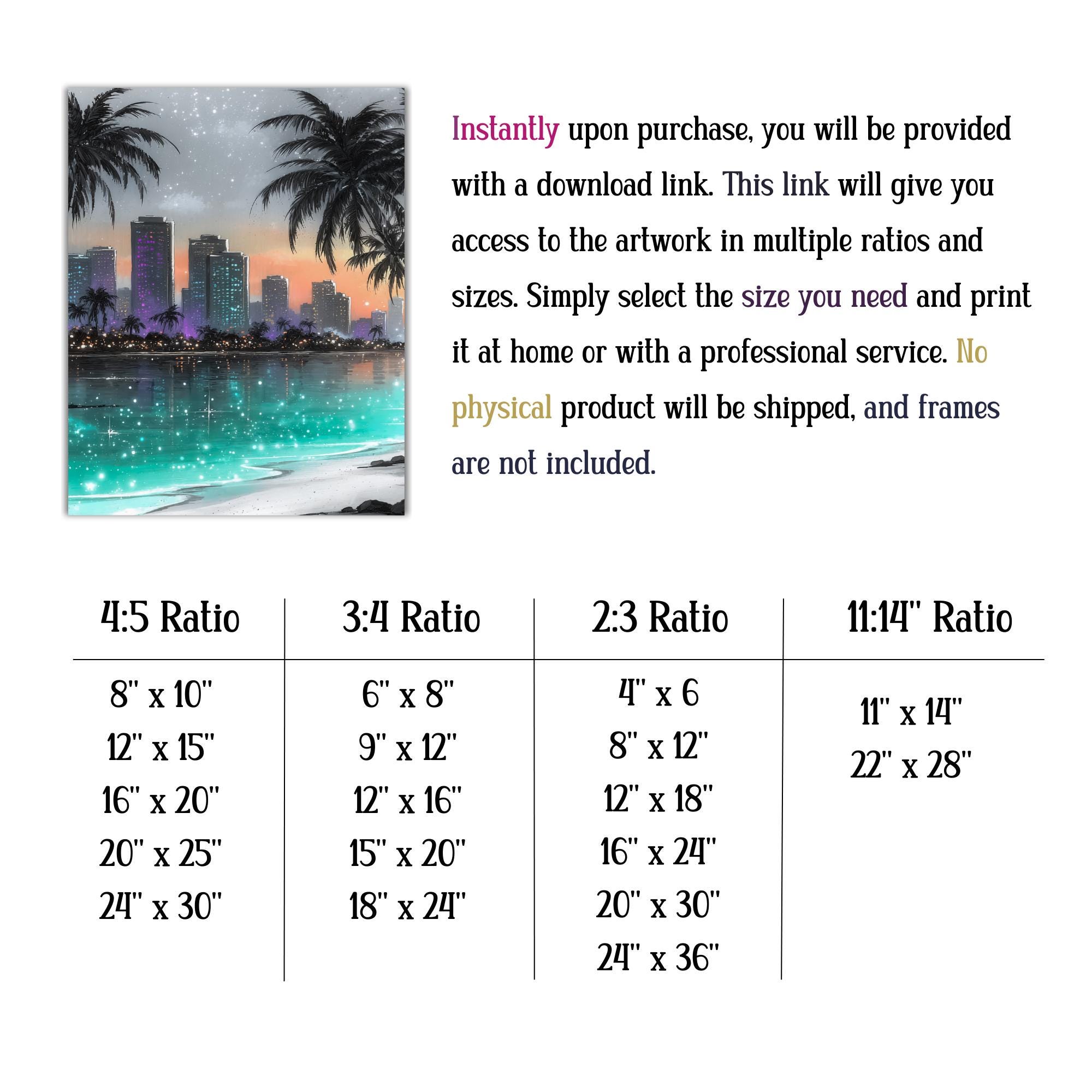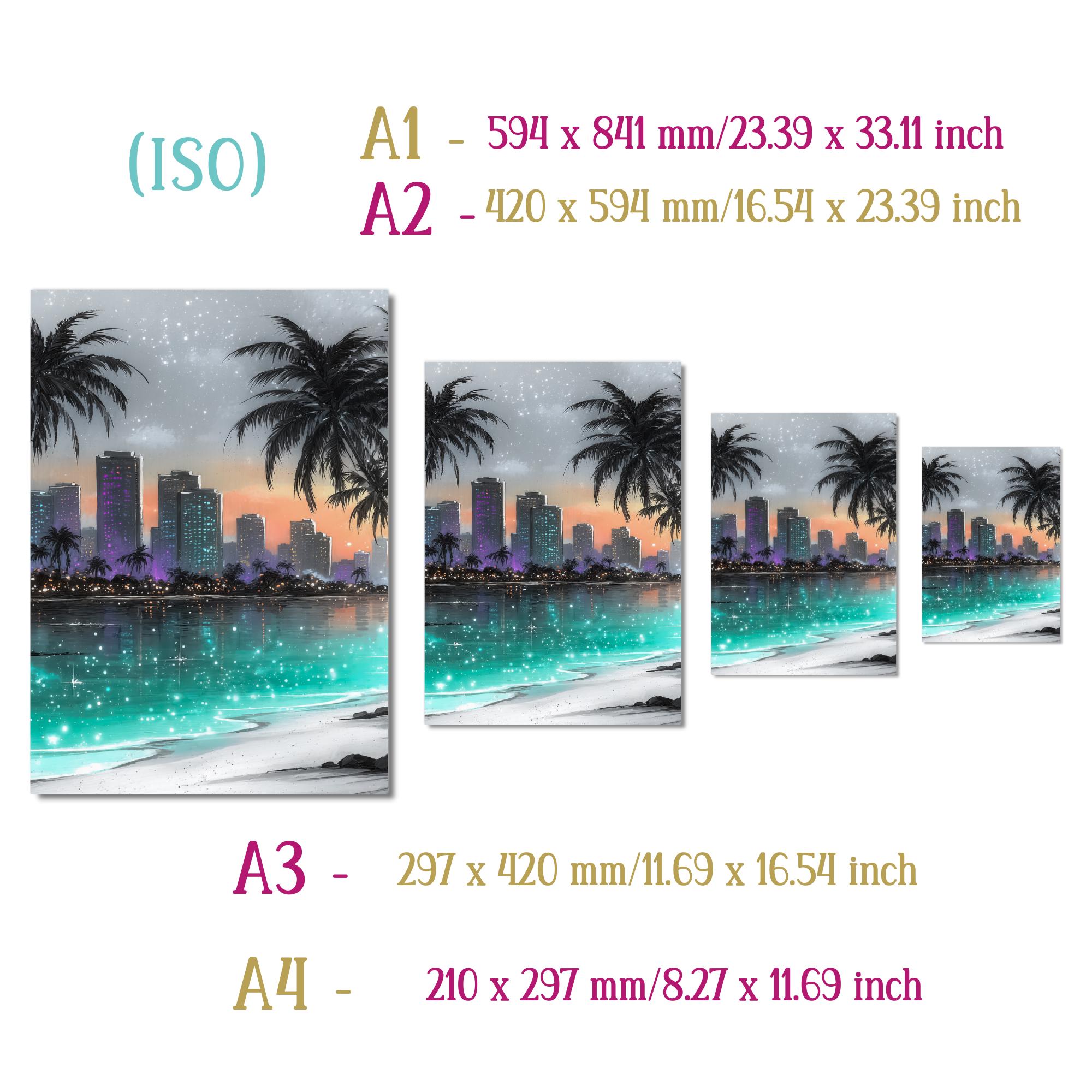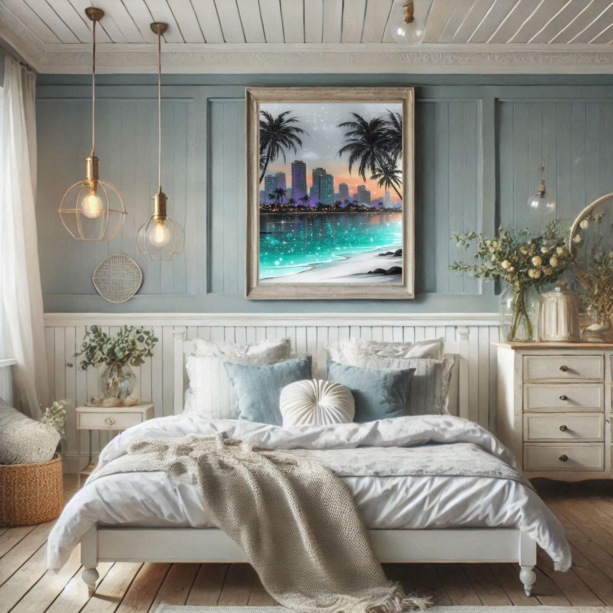 Immerse yourself in a serene blend of tropical wall art and coastal decor with this captivating cityscape print. Palm trees gently sway beside a glowing skyline, capturing the magic of a beach skyline art scene that invites calm and inspiration. Perfect for modern spaces, this digital wall art transforms any room into a dreamy retreat where ocean city artwork meets contemporary style.